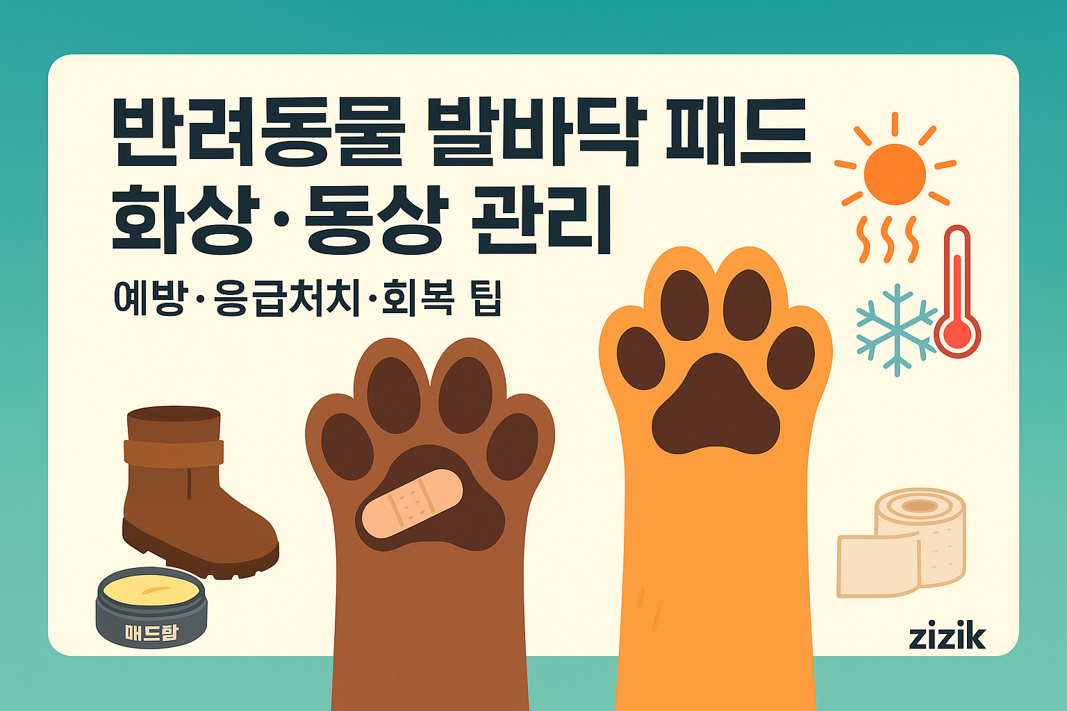 오늘 가방에 비점착 패드·거즈·탄력 붕대·보습 밤·보호부츠를 넣어두세요. 준비가 곧 안전입니다. 이 한 상자가 반려동물발바닥 패드 화상·동상 관리의 보험입니다.